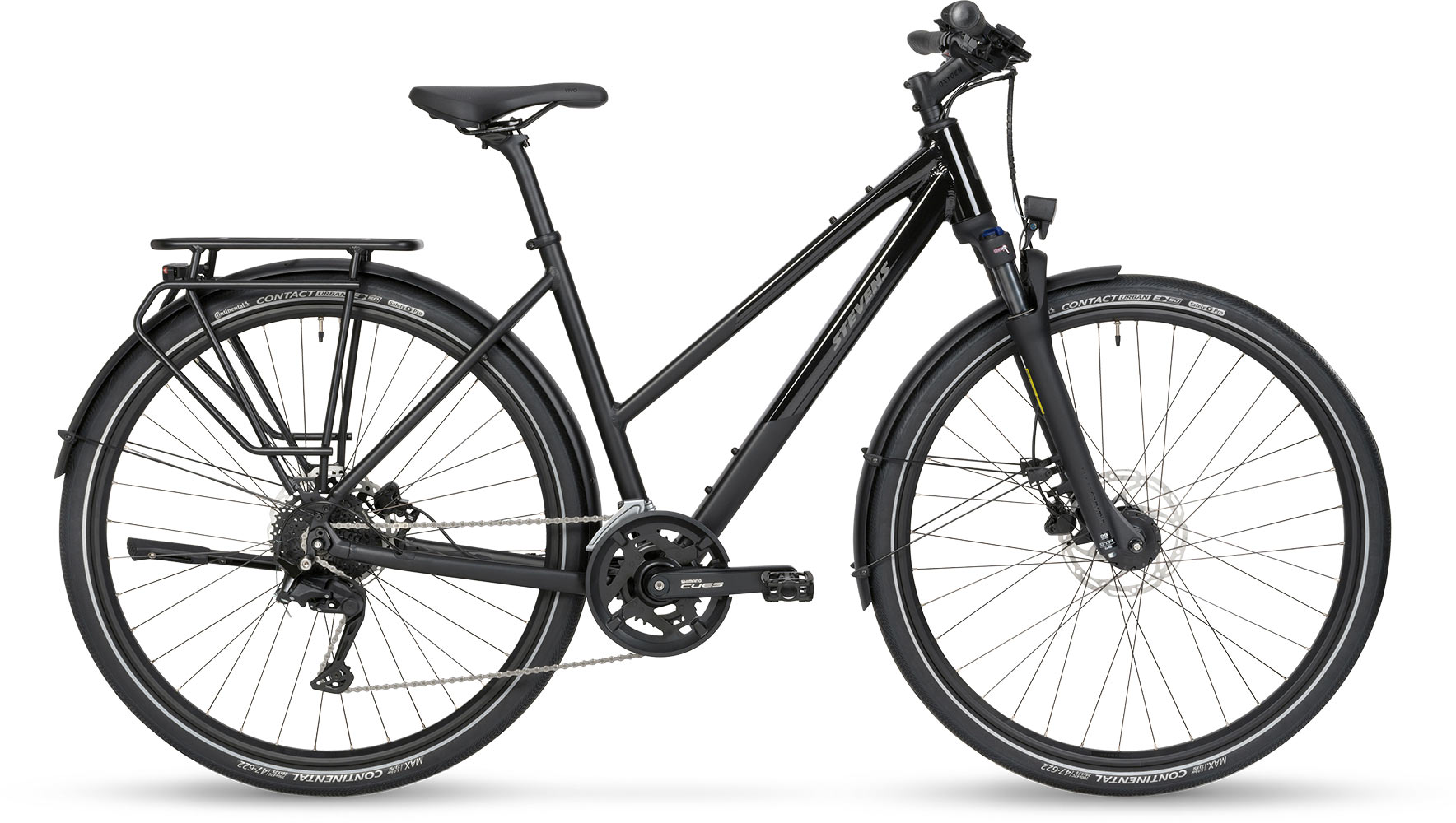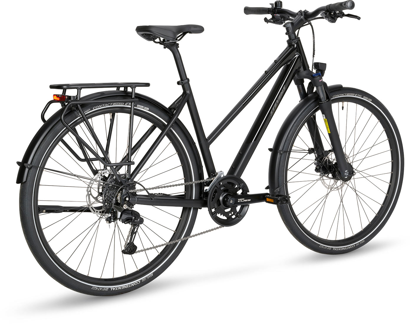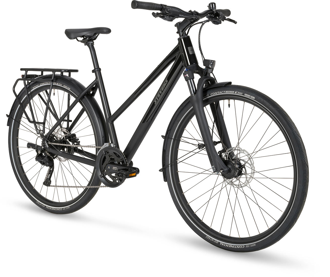 De Aviolo 6.1 – klaar voor elk avontuur. Of het nu gaat om je dagelijkse woon-werkverkeer door de stad of een uitgebreide tocht naar het onbekende, de Aviolo 6.1 is je betrouwbare metgezel in elke situatie. De STEVENS-klassieker maakt indruk met zijn elegante, matte diepzwarte afwerking en subtiele, glanzende accenten – ingetogen stijl. Het lichte aluminium frame, de comfortabele geometrie en de aangenaam uitgebalanceerde zitpositie maken elke rit tot een genot. De stalen verende voorvork met 63 mm veerweg absorbeert oneffenheden met gemak en zorgt voor merkbaar meer comfort – ook op langere afstanden. Dankzij het Shimano CUES 4000 2x9 versnellingssysteem vind je altijd de juiste versnelling – of het nu op glad asfalt of ruw grind is. De Conti Contact Urban-banden rollen licht, bieden uitstekende lekbescherming en dragen zo bij aan een allround harmonieuze rijervaring.
