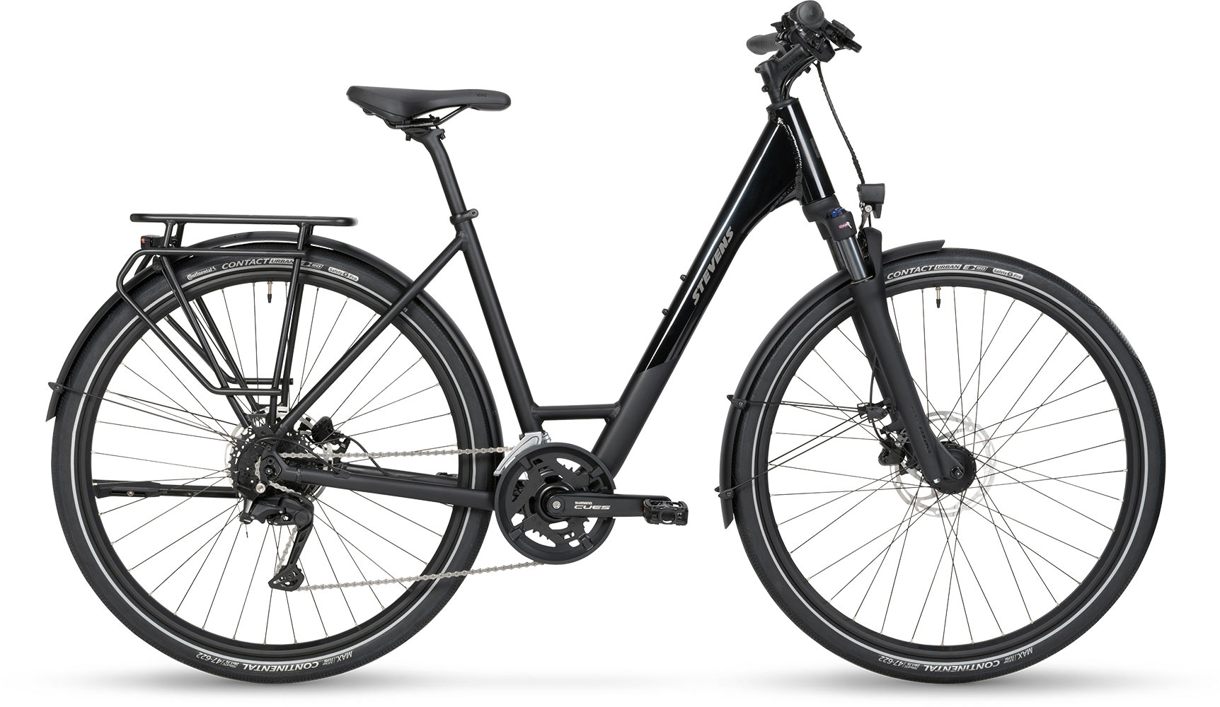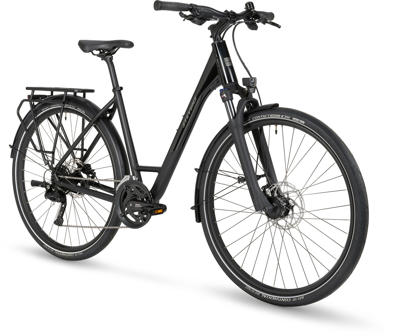 De Aviolo 6.1 – klaar voor elk avontuur. Of het nu gaat om je dagelijkse woon-werkverkeer door de stad of een uitgebreide tocht naar het onbekende, de Aviolo 6.1 is je betrouwbare metgezel in elke situatie. De STEVENS-klassieker maakt indruk met zijn elegante, matte diepzwarte afwerking en subtiele, glanzende accenten – ingetogen stijl. Het lichte aluminium frame, de comfortabele geometrie en de aangenaam uitgebalanceerde zitpositie maken elke rit tot een genot. De stalen verende voorvork met 63 mm veerweg absorbeert oneffenheden met gemak en zorgt voor merkbaar meer comfort – ook op langere afstanden. Dankzij het Shimano CUES 4000 2x9 versnellingssysteem vind je altijd de juiste versnelling – of het nu op glad asfalt of ruw grind is. De Conti Contact Urban-banden rollen licht, bieden uitstekende lekbescherming en dragen zo bij aan een allround harmonieuze rijervaring.